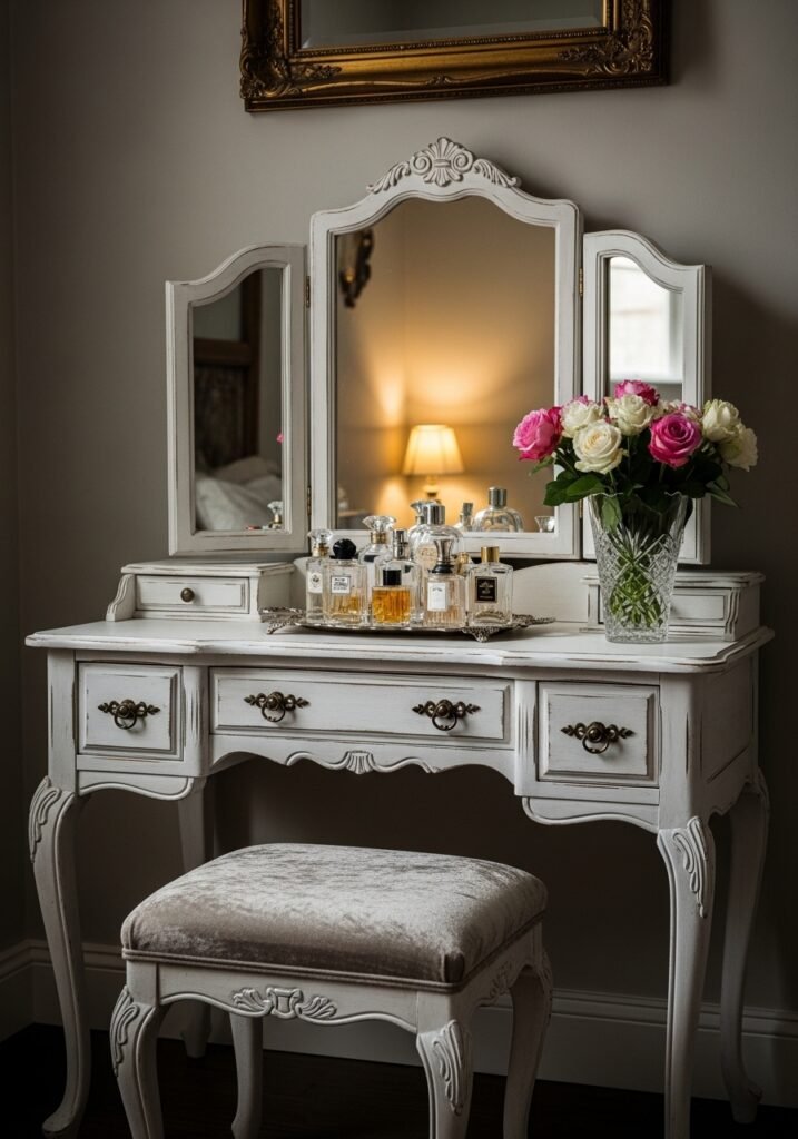 An antique vanity dressing table adds both function and old-world glamour to your bedroom. Look for pieces with a tri-fold mirror, carved legs, and small drawers for storing jewelry and beauty essentials. Vintage vanities in distressed white, natural wood, or painted pastels become a gorgeous focal point that makes getting ready feel like a special ritual.