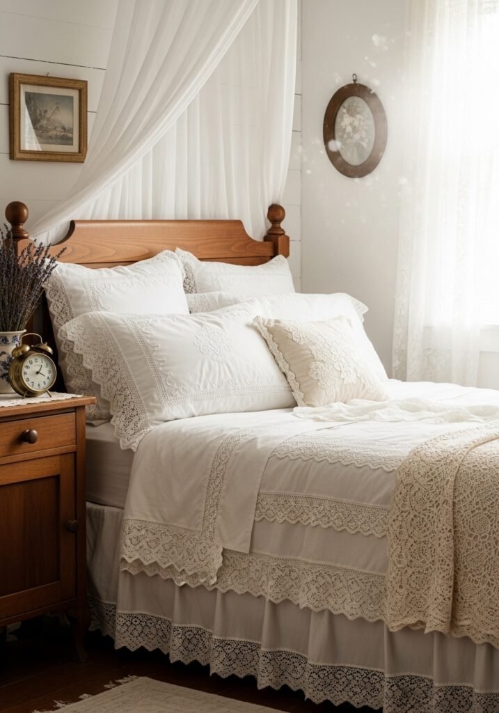 Layering lace and crochet textiles on your bed is an effortless way to achieve vintage charm. Think crocheted bedspreads, lace-trimmed pillowcases, and embroidered shams stacked together in a beautiful, textured arrangement. Stick to a white or cream palette for an airy, romantic aesthetic that looks straight out of a countryside cottage.