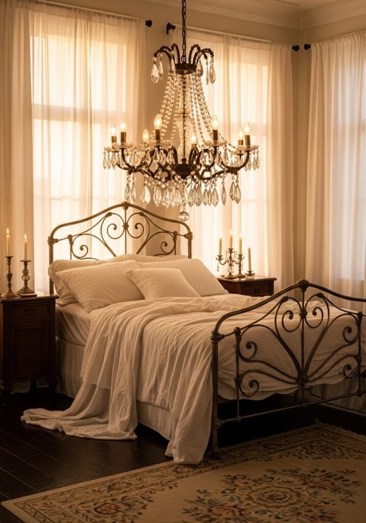 A crystal chandelier is one of the most glamorous vintage bedroom ideas you can implement. Even small chandeliers make a big impact in a bedroom setting. Hang one directly above the bed or in the center of the room for maximum effect. Pair it with soft ambient lighting from bedside lamps to create a layered, enchanting atmosphere.