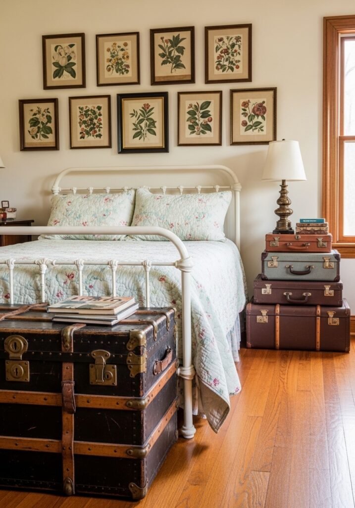 Placing a vintage trunk at the foot of your bed serves as both storage and a stunning style statement. Old steamer trunks, leather travel cases, or painted wooden chests add history and personality to the room. They’re perfect for storing extra blankets, pillows, or seasonal clothing while looking absolutely gorgeous.