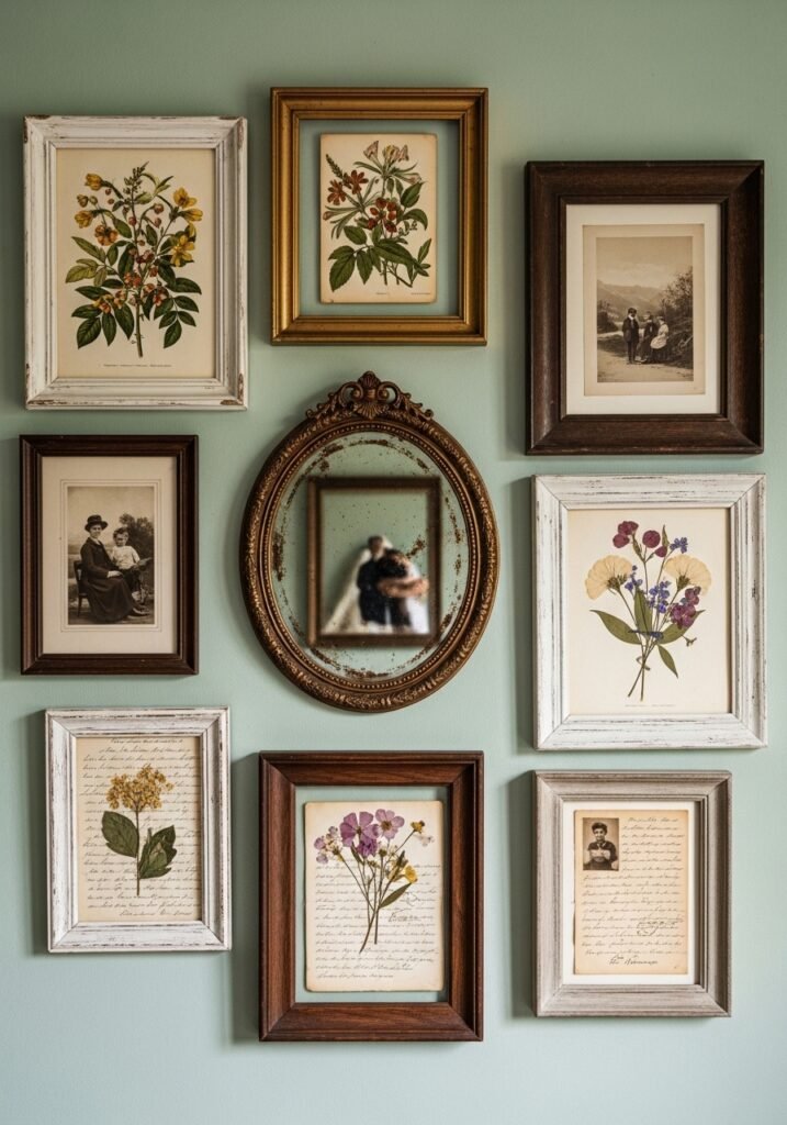 Creating a gallery wall using mismatched vintage frames is a Pinterest-favorite decorating technique. Collect ornate gold frames, distressed white frames, and dark wood frames of varying sizes. Fill them with botanical prints, vintage photographs, old letters, or pressed flowers to create an eclectic, curated display full of personality.